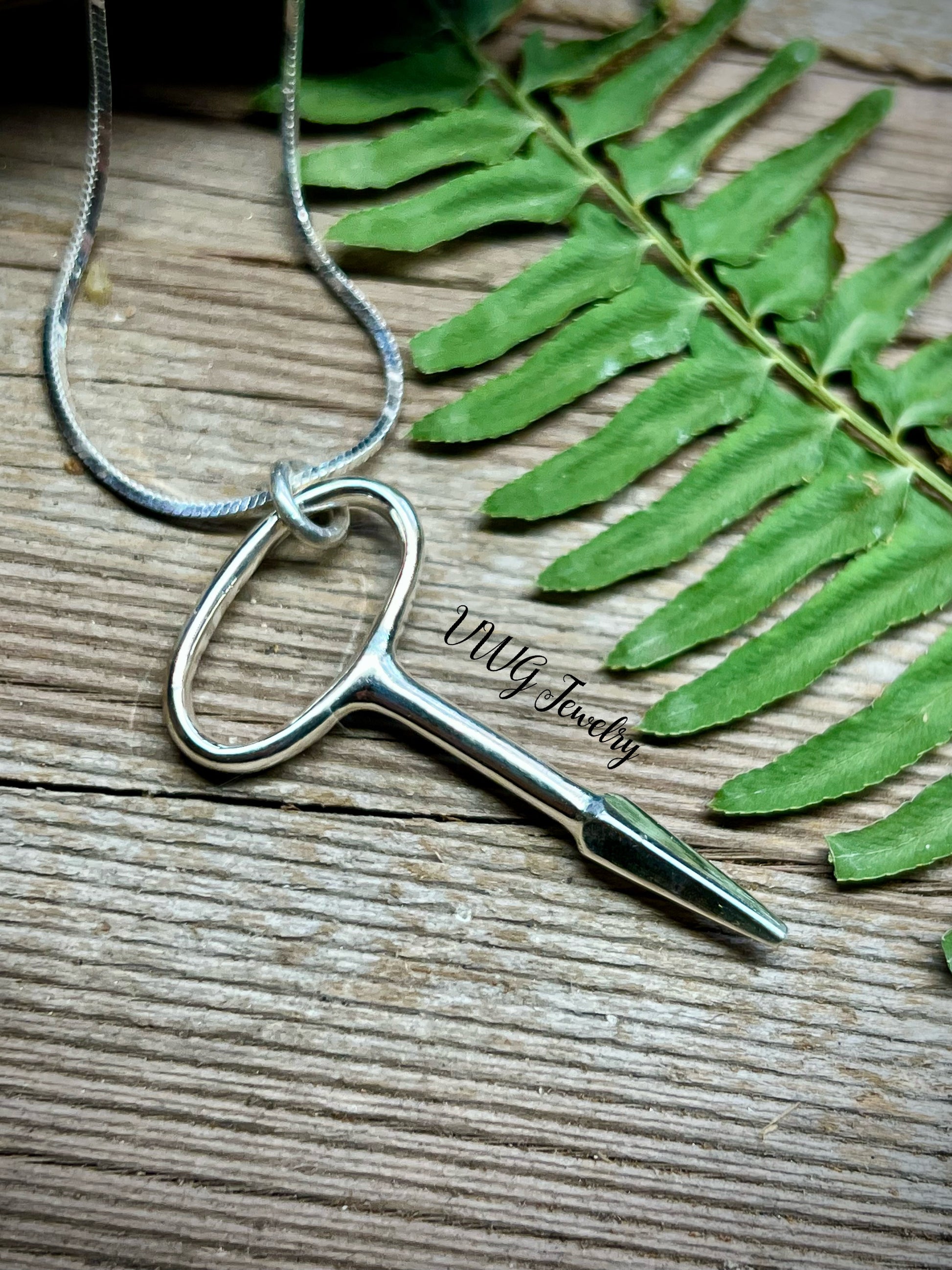 Key hung from a hand twisted durable black polyester cord, ready to wear or simply replace with your favorite chain.