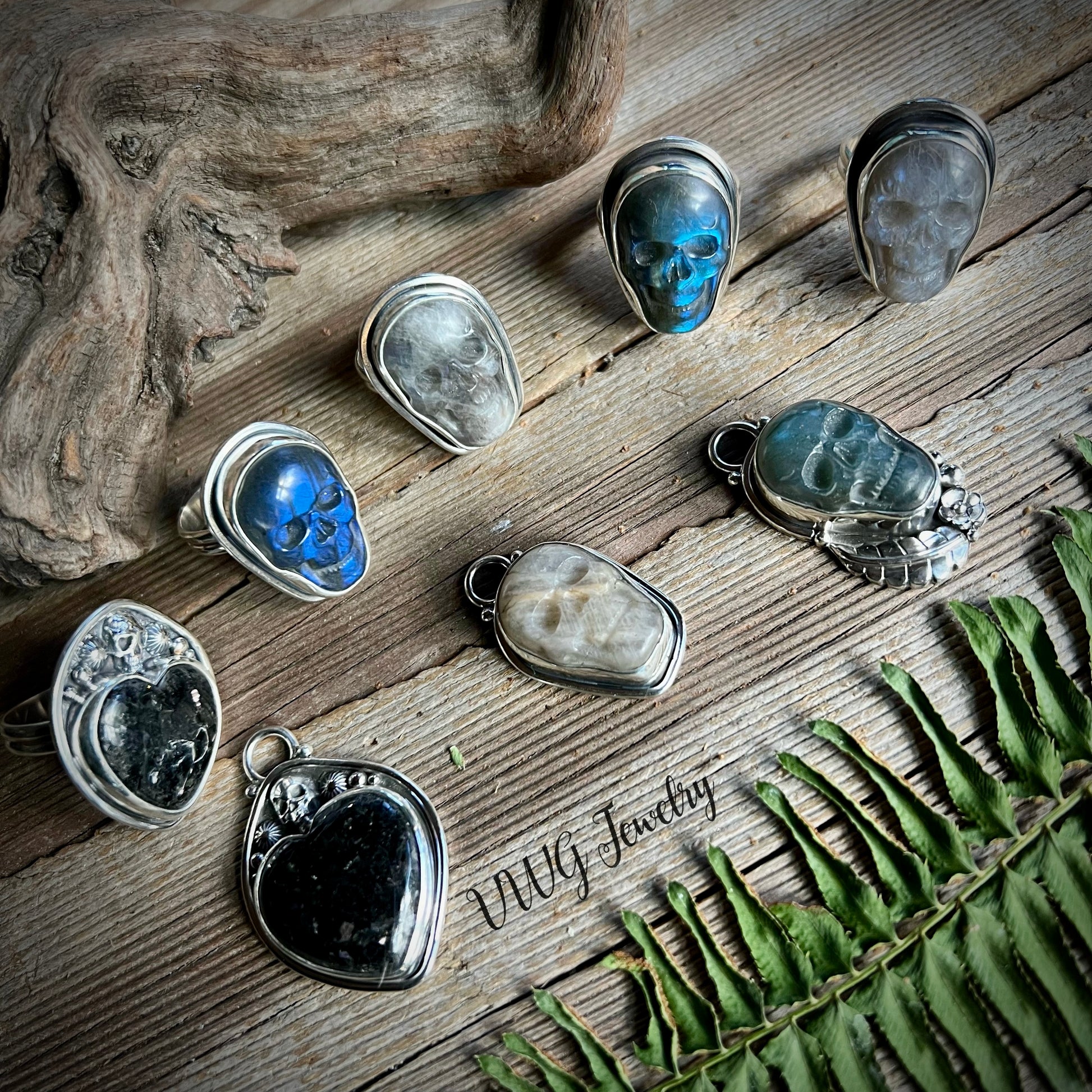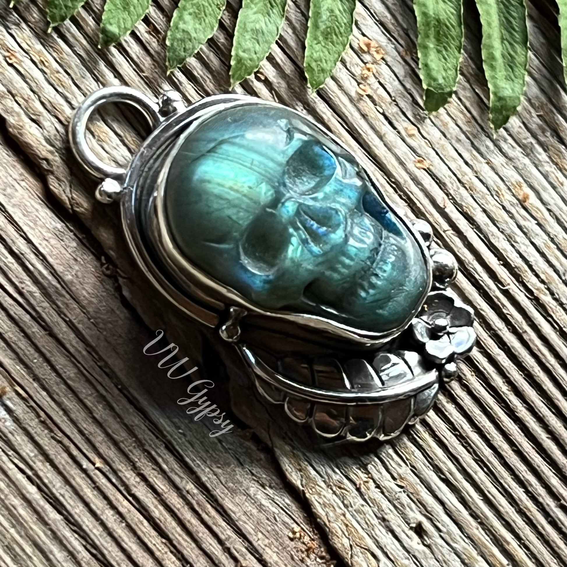 My love of the Sugar Skulls and the Catrina floral style come together beautifully with this colorful flashy Labradorite stone. To me these pieces embody my love and memories for all those that came before me.