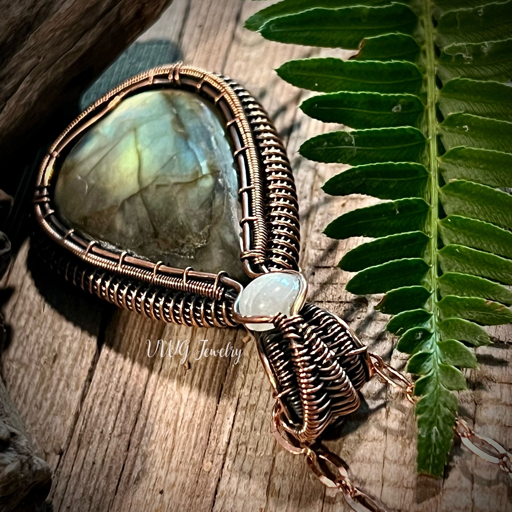 A Little touch of the moon magic with the rainbow of colors found in Labradorite Stone. This bold piece of flashy Labradorite is suspended in Copper with a moon stone bead. A beautiful statement piece to add a touch of natural beauty to any outfit.