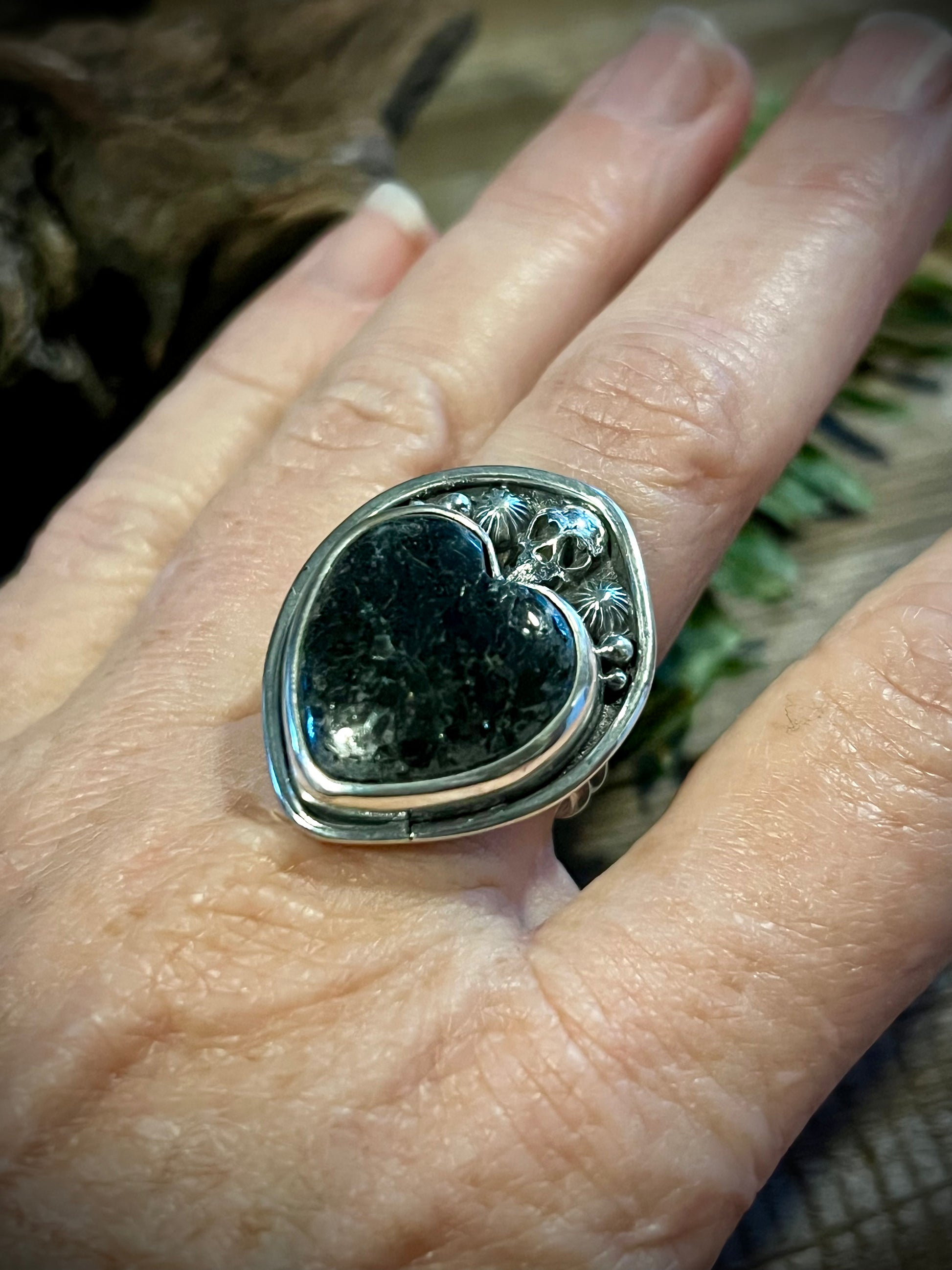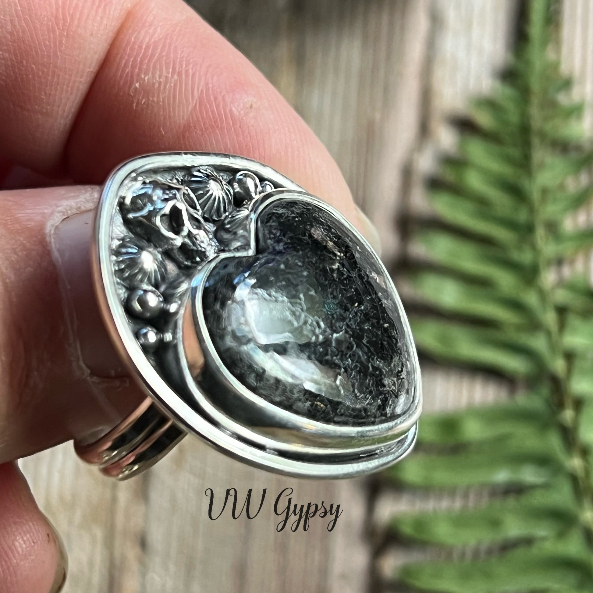 My love of the sugar skulls is highlighted with this Nuummite black stone with shimmering flacks.  To me these pieces embody my love and memories for all those that came before me.