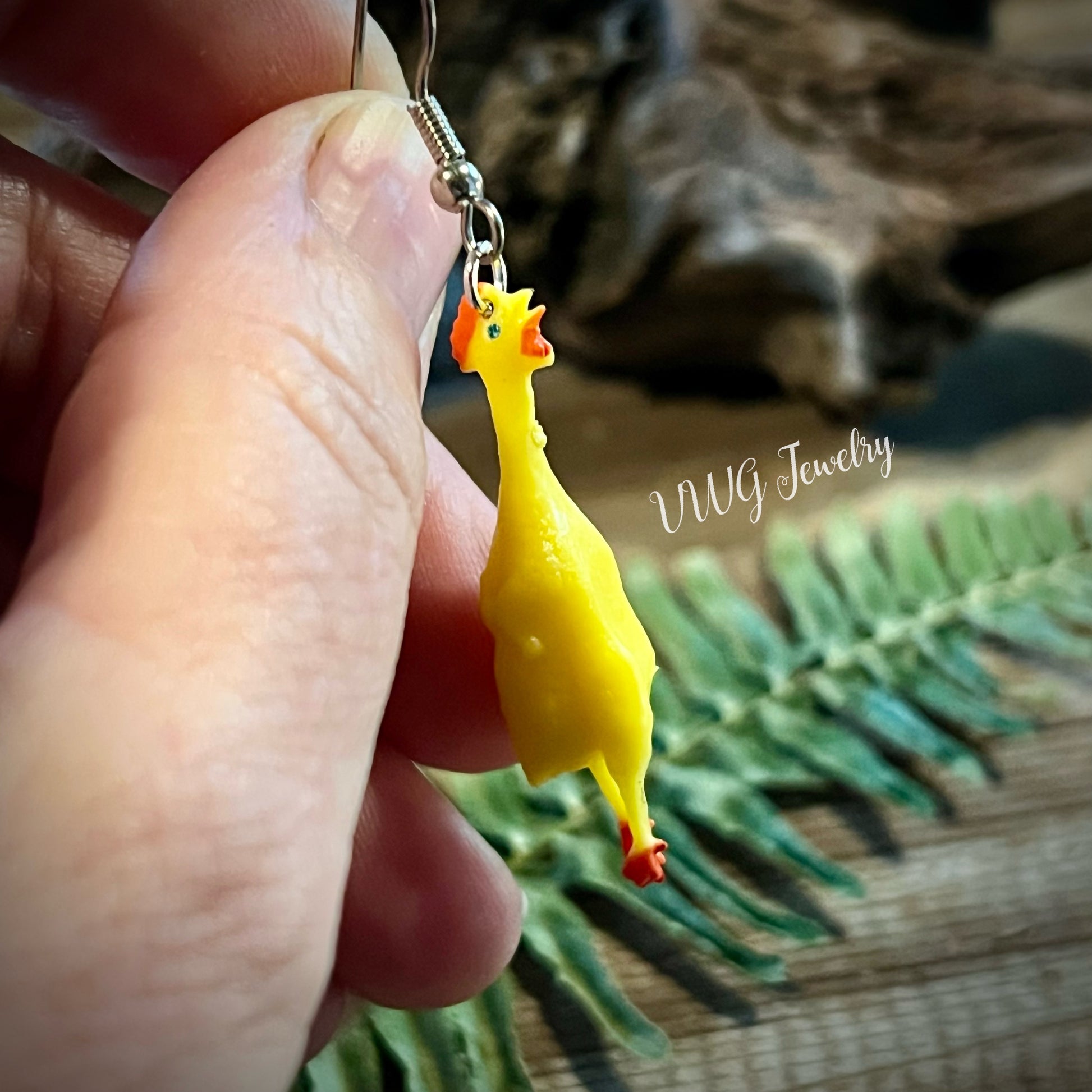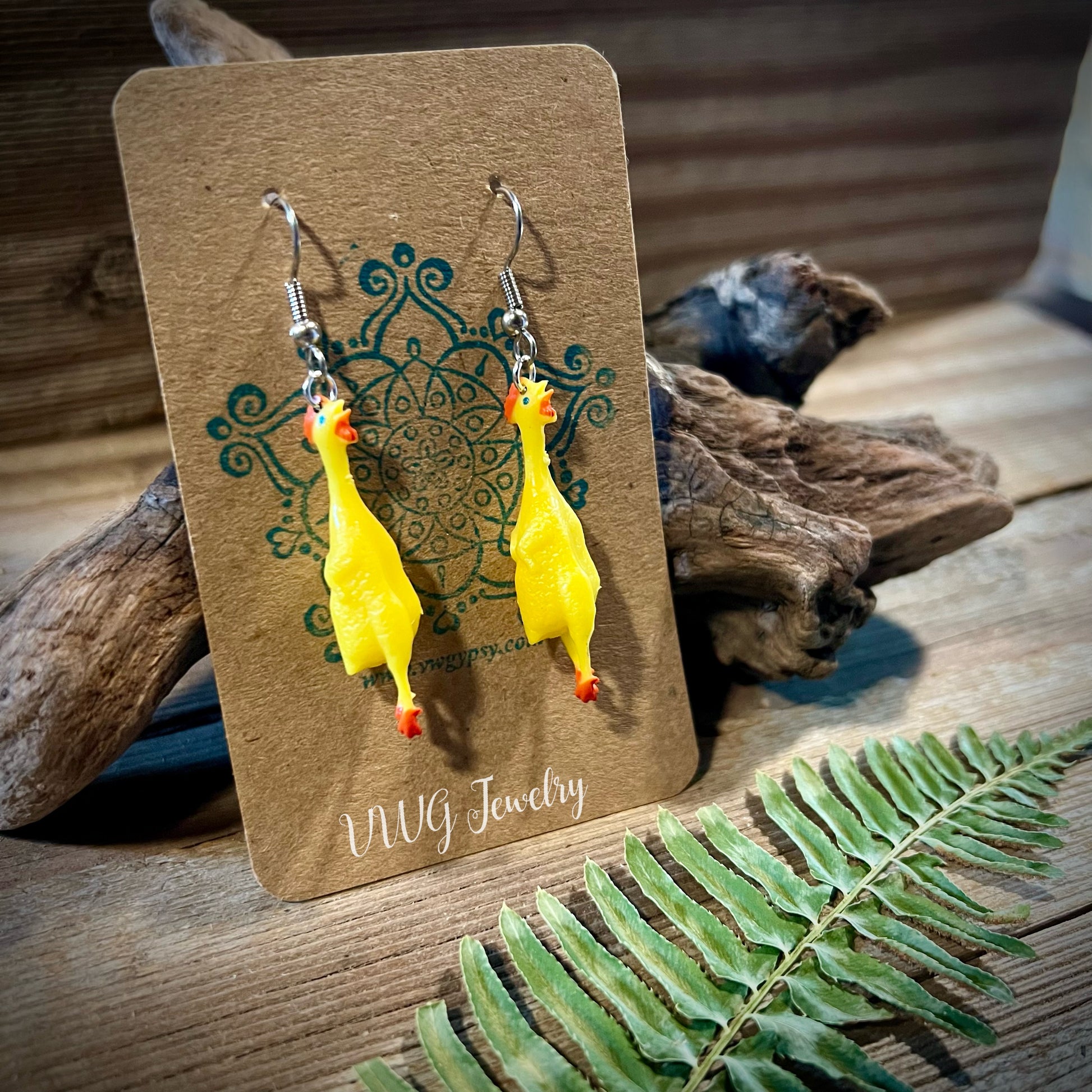 After visiting the Rubber Chicken Museum in Seattle, I just had to bring home a baggie full of these fun miniature rubber chickens and make them earrings. I hope you enjoy the as much as I do.